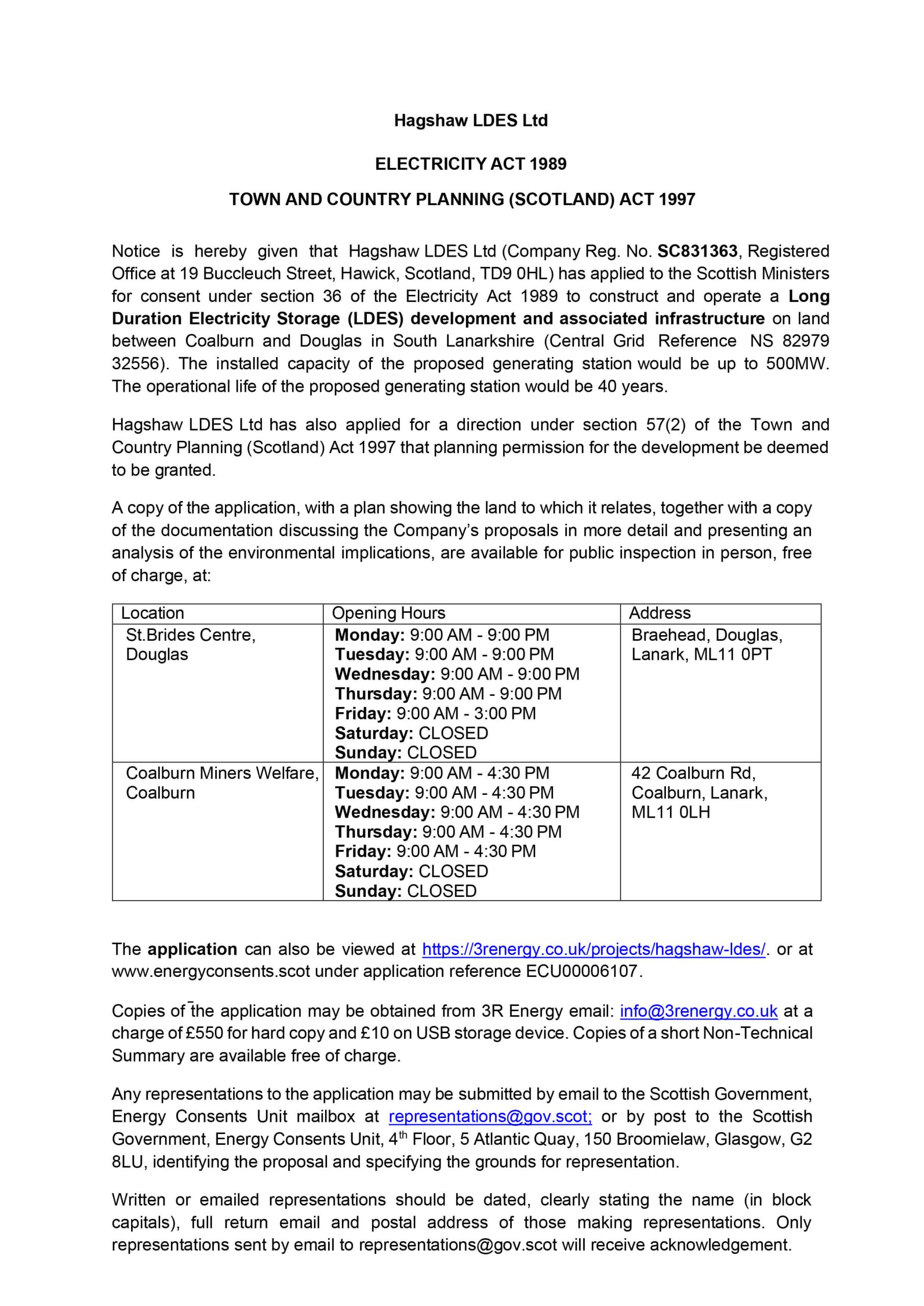 The application for the Proposed Development has now been submitted under Section 36 of the Electricity Act 1989 to the Scottish Government Energy Consents Unit (ECU) seeking consent for the Hagshaw LDES project.